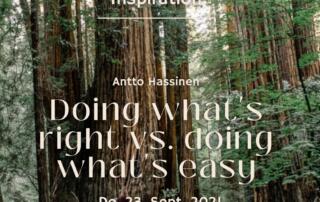 „Thursday Inspiration“: Donnerstag, 16.9. 2021 von 19:30 – 20:30 UHR Lesung zum Thema „Doing what's right vs. doing what's easy “mit anschließender Reflektion von Antto Hassinen