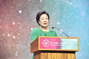 Frau Dr. Hak Ja Han Moon, die Hauptrednerin des Abends, wurde von Dr. Werner Fasslabend, ehemaliger österreichischer Verteidigungsminister, vorgestellt. Dr. Fasslabend teilte seine Erfahrung, dass es relativ leicht ist, den Frieden zu zerstören, wohingegen es großer Anstrengungen bedarf, den Frieden wiederherzustellen und zu erhalten. Er erinnerte auch an einen Grundsatz des verstorbenen Rev. Moon, nämlich dass wir zuerst Frieden in uns selbst schaffen müssen, bevor wir Frieden in der Welt erwarten können.