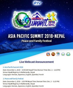 Frau Dr. Hak Ja Han Moon kam gestern, 29. Nov. 2018 in Katmandu, Nepal zu einem Internationalen Gipfeltreffen, dem „Asia Pacific Summit“ an. Morgen, Samstag, kann man das internationale Treffen von Politikern, religiösen Würdenträgern und Persönlichkeiten des öffentlichen Lebens live mitverfolgen.